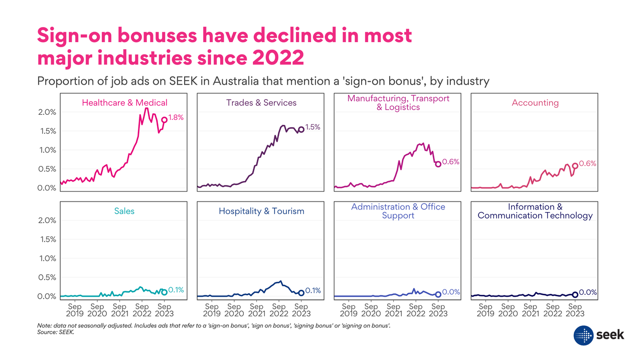 COVID created enormous disruptions to the Australian labour market – first as the world of work adapted to lockdowns and restrictions, and then as the market boomed in 2021-22. The boom in sign-on bonuses – albeit from a low base – is an example of how employers have adapted to this evolving market. As conditions come back towards something that looks more like the pre-COVID normal, employers will undoubtedly continue to adapt – and we may see sign-on bonuses go back to being the rarity they once were.