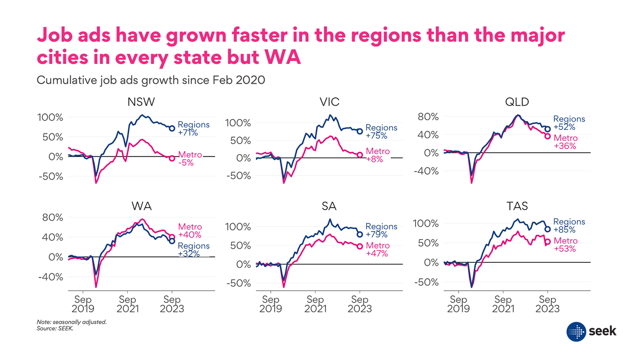 Regional job ads booming in the other states, too, though the gap between regional areas and the major cities is not as stark as in NSW and Victoria.