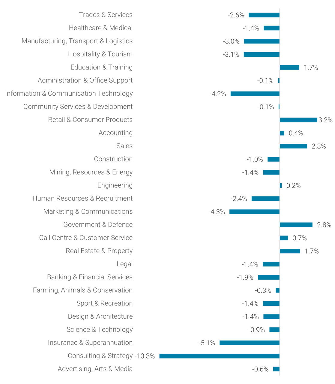New South Wales (-3.6%), Queensland (-1.2%) and South Australia (-4.4%) experienced declining job ad volumes. Tasmania, while relatively small and therefore more susceptible to fluctuation on a month-to-month basis, recorded a 10.0% drop, due to declines in ads within Trades & Services (-15.9%) and Healthcare & Medical (-10.7%), among other industries.