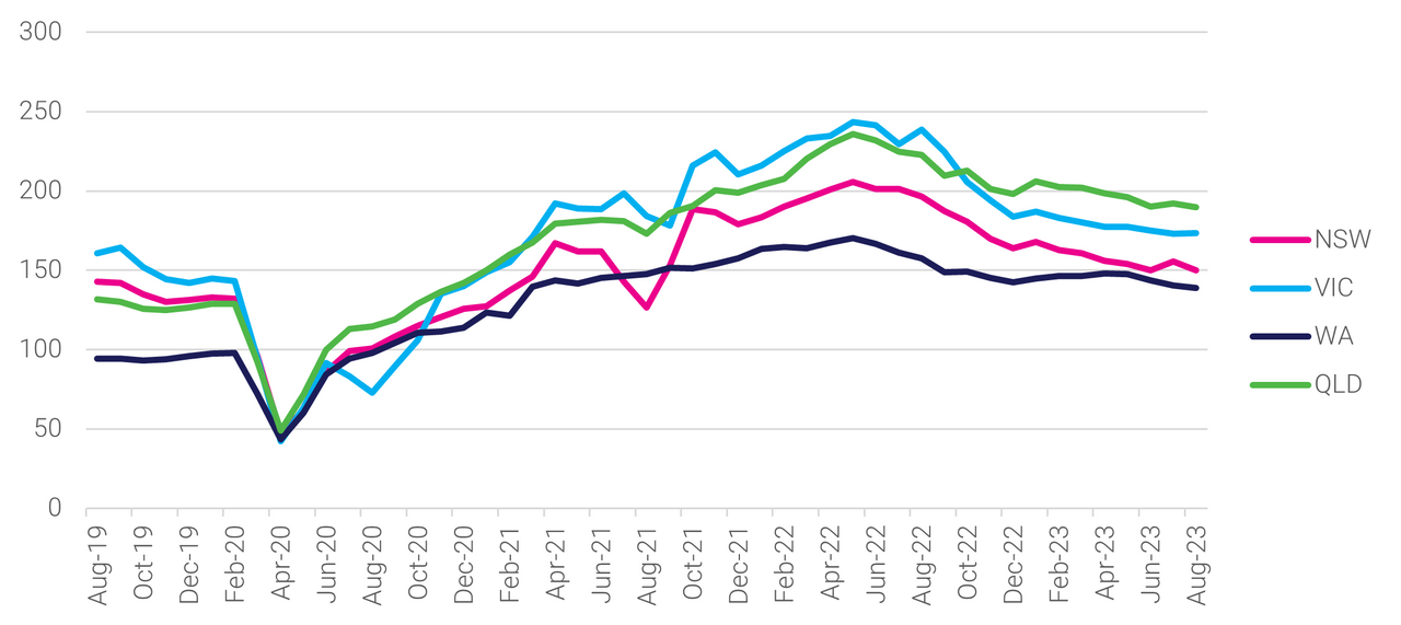 Figure 3: Major state job ad trends: August 2019 to August 2023. Index: 100 = 2013 avg