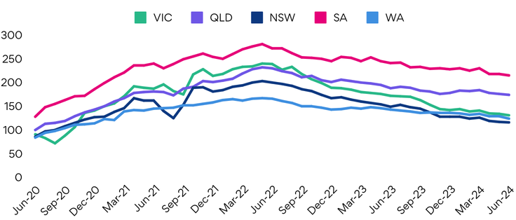 Queensland has been the most resilient state over the past year, with volumes falling at a much slower pace compared to the other East Coast states, down 7.5% y/y. This is due to increasing hiring activity in Construction and Real Estate & Property, among other industries.