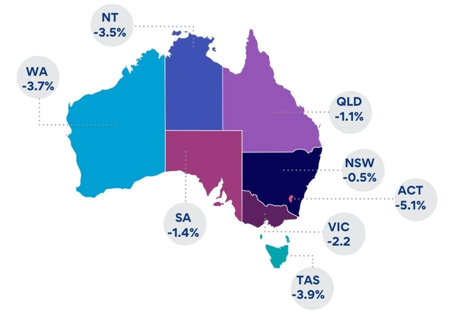 All states and territories contributed to the national decline, led by Victoria (-2.2%) and Western Australia (-3.7%).