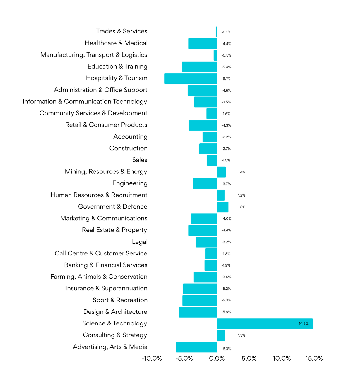 The largest decline y/y was in the most populous states of Victoria (-24.2%) and New South Wales (-21.7%), followed by the Australian Capital Territory (-15.7%). In Victoria, Hospitality & Tourism job ads are down 42% y/y.