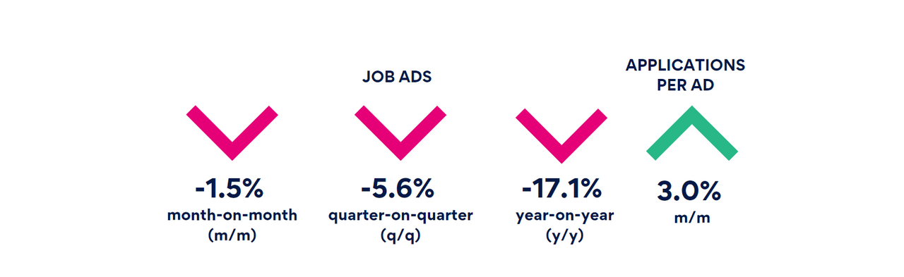 Job ads declined 1.5% month-on-month (m/m) and are 17.1% lower year-on-year (y/y).