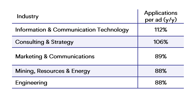 Applications per job ad have doubled y/y for Information & Communication Technology and Consulting & Strategy roles.