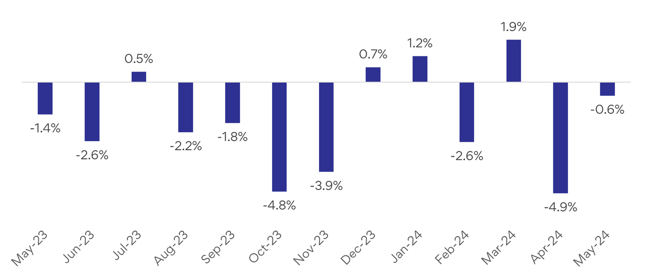 Figure 1: National SEEK job ad percentage change m/m May 2023 to May 2024