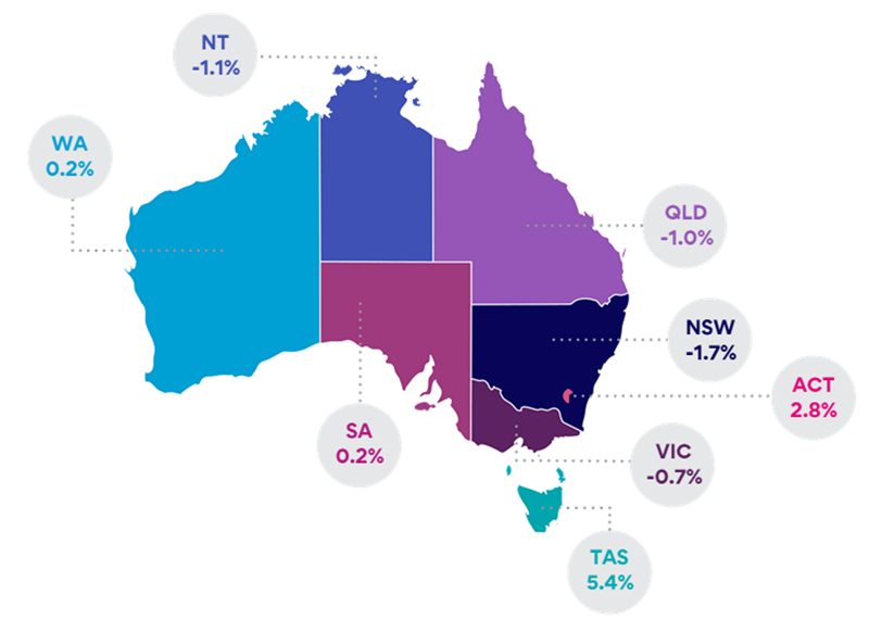 Figure 2: State and territory job ad growth/decline comparing May 2024 to April 2024 (m/m).