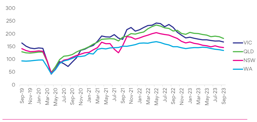 Figure 3: Major state job ad trends: September 2019 to September 2023. Index: 100 = 2013 avg