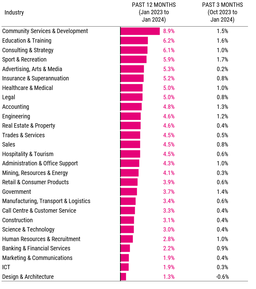 At the other end of the scale, the Information & Communications Technology industry recorded the slowest growth of any major industry, at just 1.9% in the year to January. The three months to January were even slower, at just 0.3% over the quarter. This reflects the ongoing challenges in the technology sector, with relatively soft demand for labour after a booming market pre-2022.