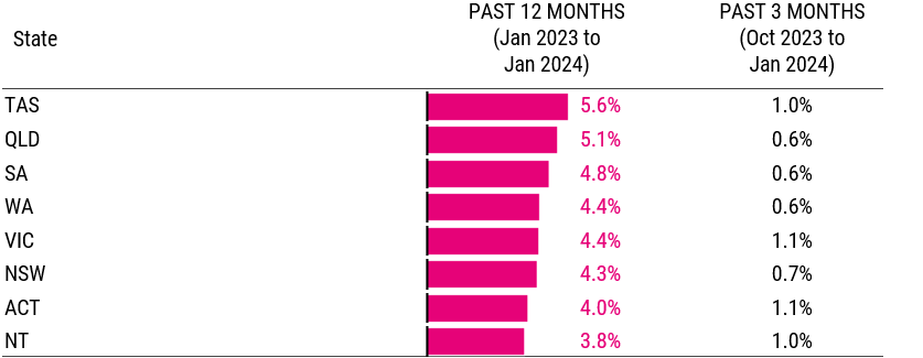Despite being more generally volatile than the rest of the country, the Northern Territory recorded the slowest ASI in the year to January, with its growth rate over the past three months now close to or on par with Victoria, Tasmania and the Australian Capital Territory.