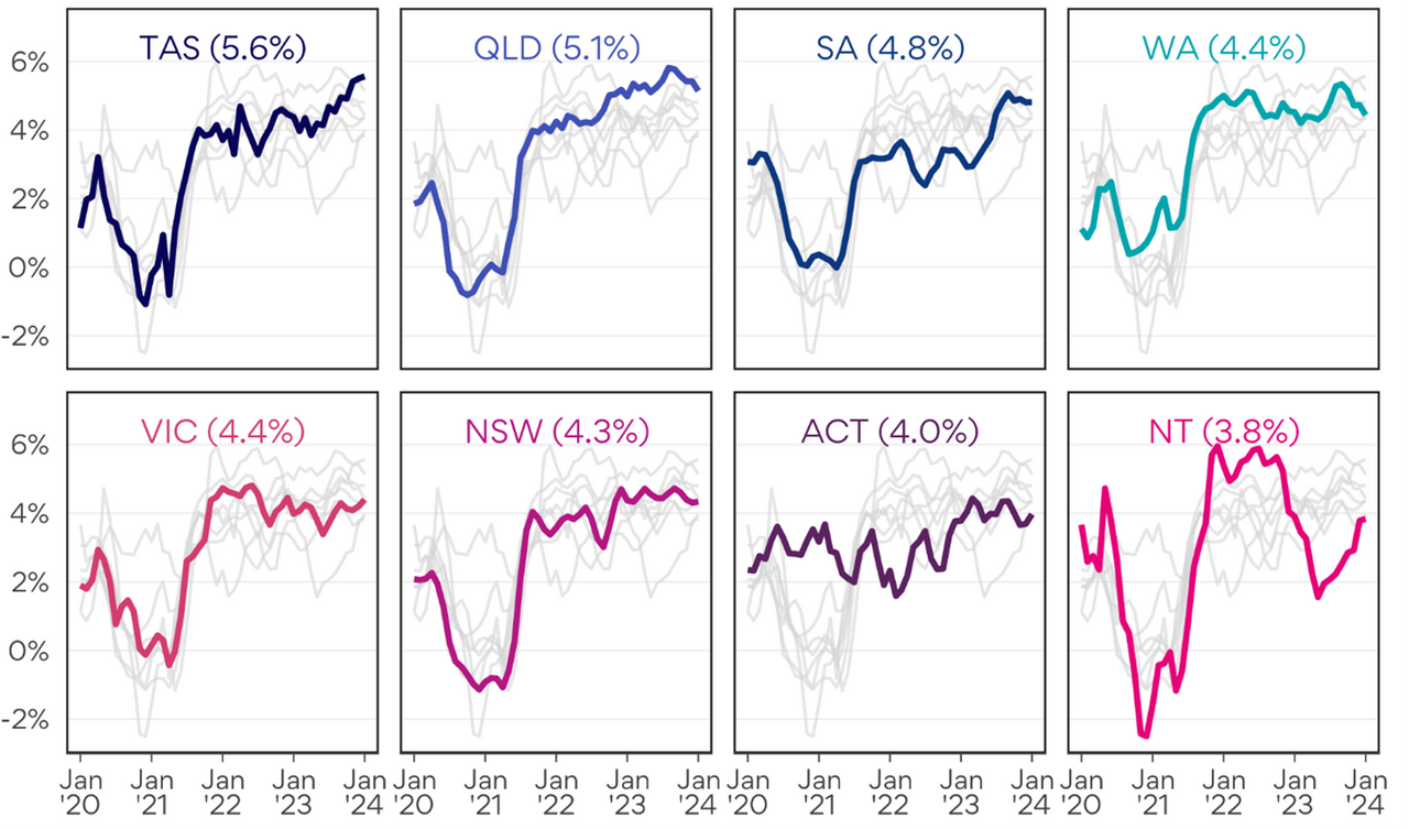 NSW (4.3%) and Victoria (4.4%) recorded below-average increases for the same period, reflecting ongoing sluggishness in labour demand in the less populous states.