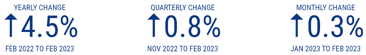 The SEEK ASI rose 4.5% over the year to February 2023, up from 4.4% in January 2023.