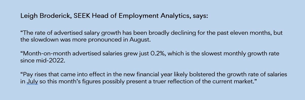 The SEEK Advertised Salary Index (ASI) measures the growth in advertised salaries for jobs posted on SEEK in Australia. This report provides a snapshot of the monthly data. The next quarterly SEEK ASI report will be released in November and will contain industry and state trends.