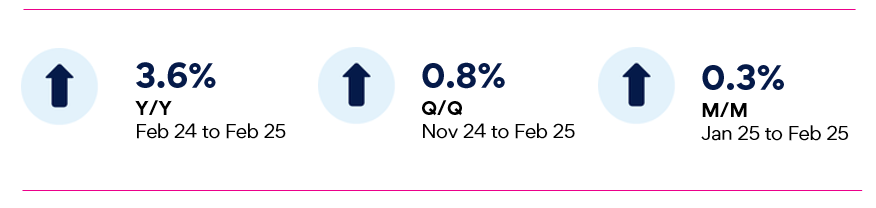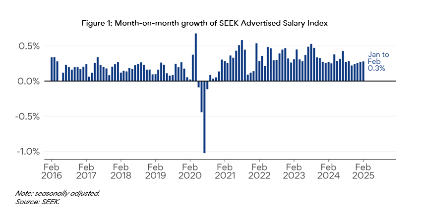 Advertised salary growth rose by 0.3% m/m in February, with relatively stable growth in recent months.