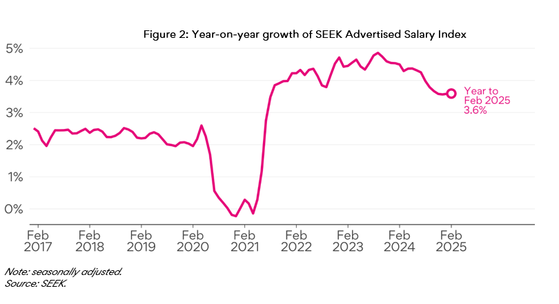 “Advertised salary growth had been slowing alongside a loosening labour market, with annual growth down 1.3 percentage points from its peak in September 2023. The deceleration has stalled recently as a more balanced labour market has emerged over the second half of 2024.