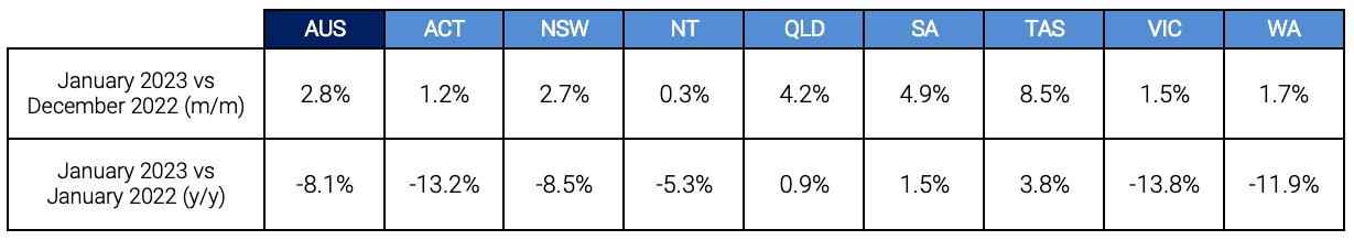 Table 1: National, state and territory job ad growth/decline comparing January 2023 to: i) December 2022 (m/m), and ii) January 2021 (y/y).