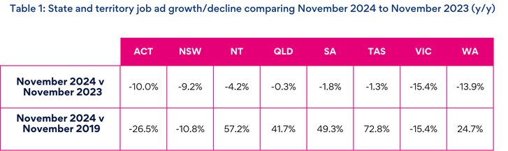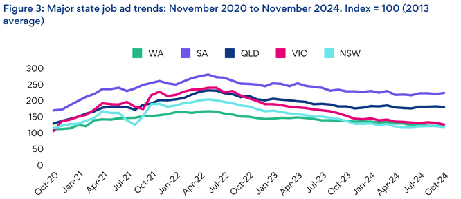 The four largest states and the Northern Territory recorded job ad decline in November, led by Western Australia (-3.2%) and Victoria (-2.3%).