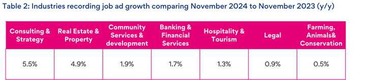 Despite a broad decline in ad volumes all year, some industries are recording slightly higher ad volumes compared to November 2023, including Consulting & Strategy (5.5% y/y) and Real Estate & Property (4.9% y/y).