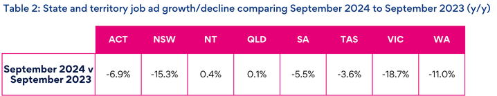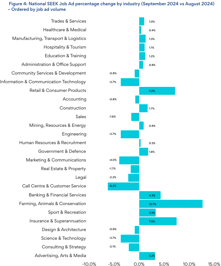 Increased demand in Trades & Services (1.0%) and Manufacturing, Transport & Logistics (1.3%), though marginal, also supported the overall rise in job ad volumes in September, whereas Information & Communication Technology (-3.7%) and Call Centre & Customer Service (-6.3%) were the largest industries to record a decline m/m.