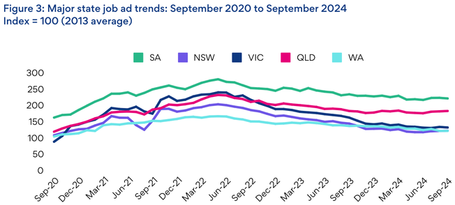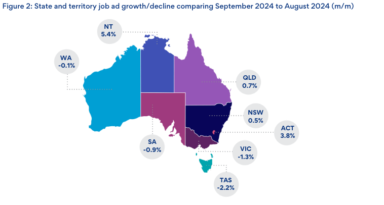 The two territories were the other regions where jobs ads rose, increasing 5.4% in the Northern Territory and 3.8% in the Australian Capital Territory.