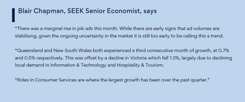 Job ad volumes rose in both Queensland (0.7%) and New South Wales (0.5%) for the third consecutive month.