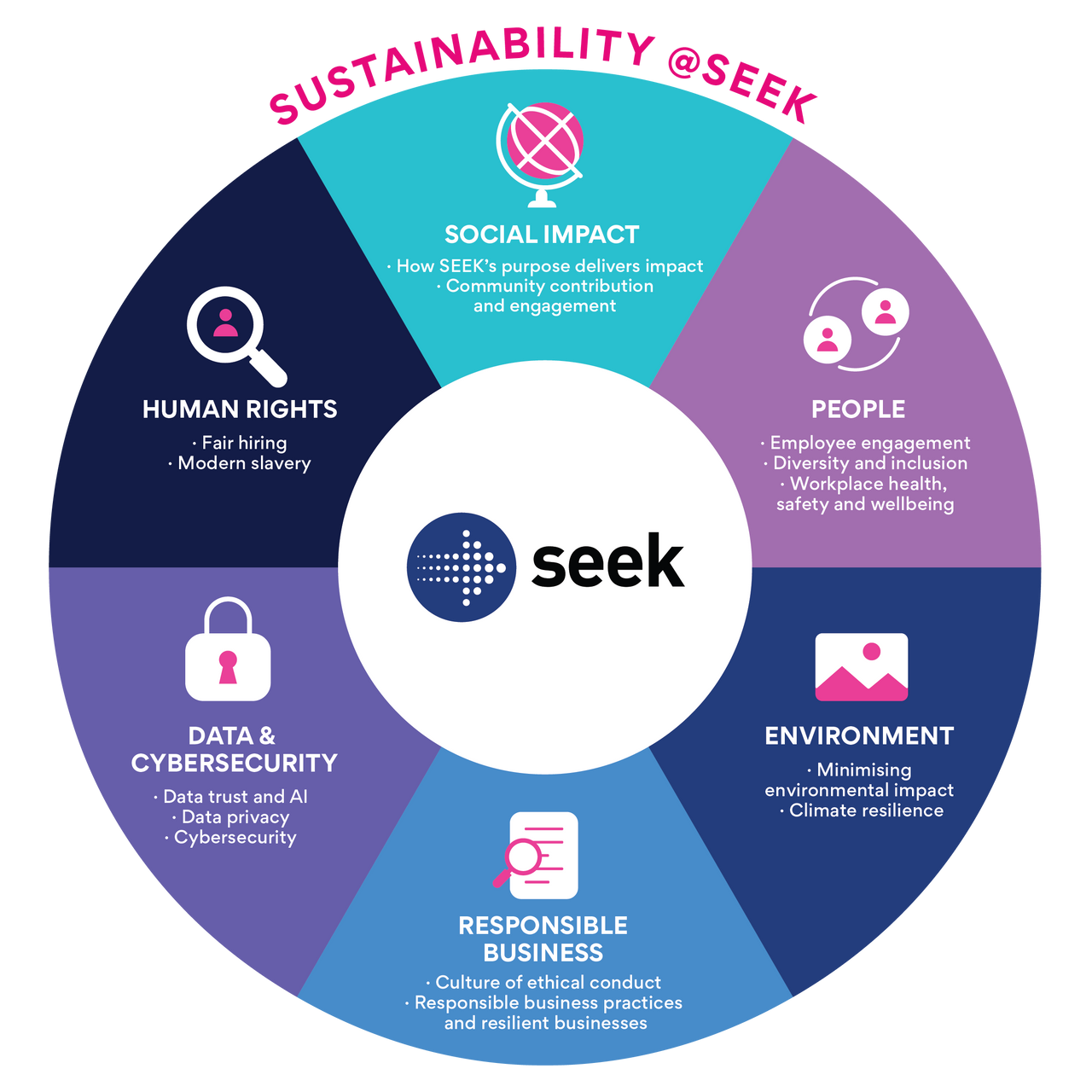 SEEK’s approach to sustainability prioritises six areas where we can have the greatest impact – social impact, human rights, data and cybersecurity, people, environment and responsible business.