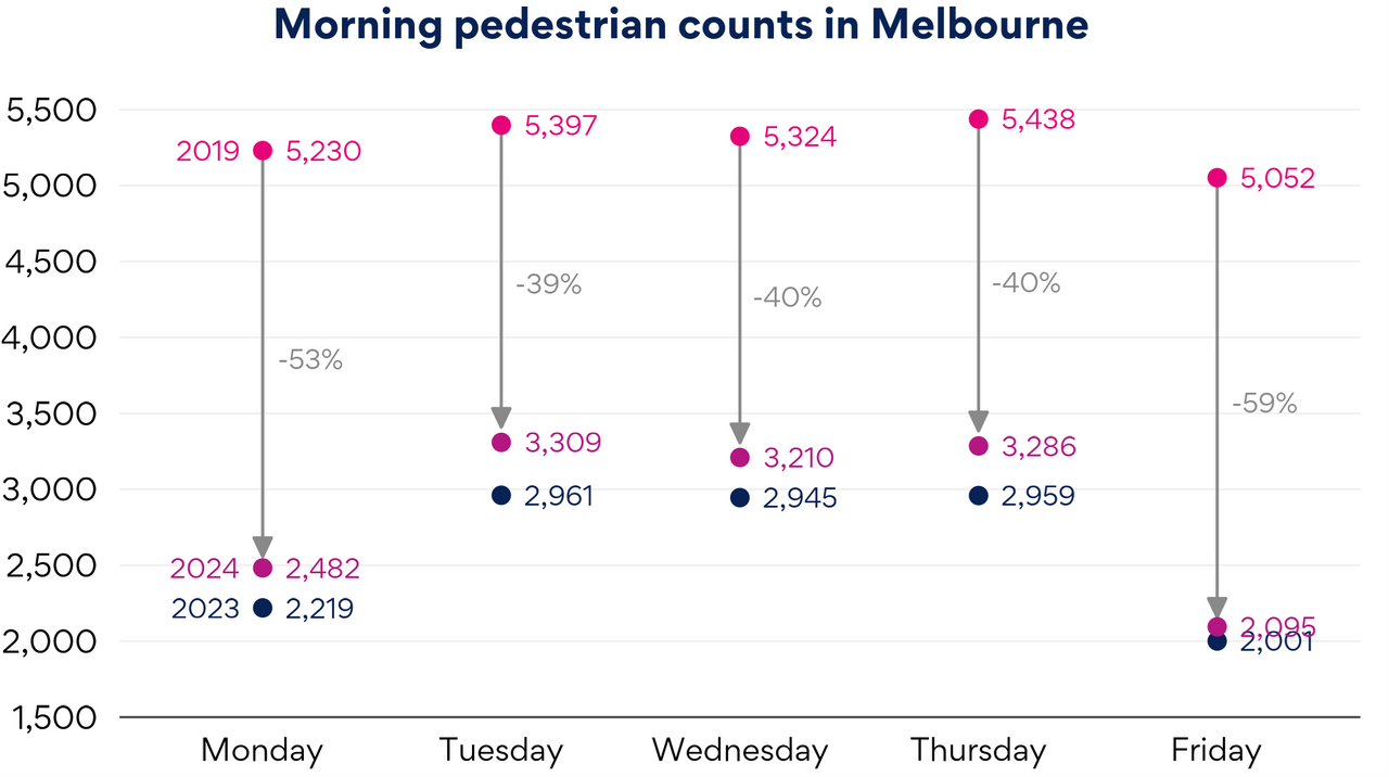 City of Melbourne pedestrian counts can be useful to get a sense of the extent of the RTO that has occurred over the last couple of years. Average annual morning foot traffic shows counts are still well down on their pre-COVID levels but increased between 2023 and 2024.