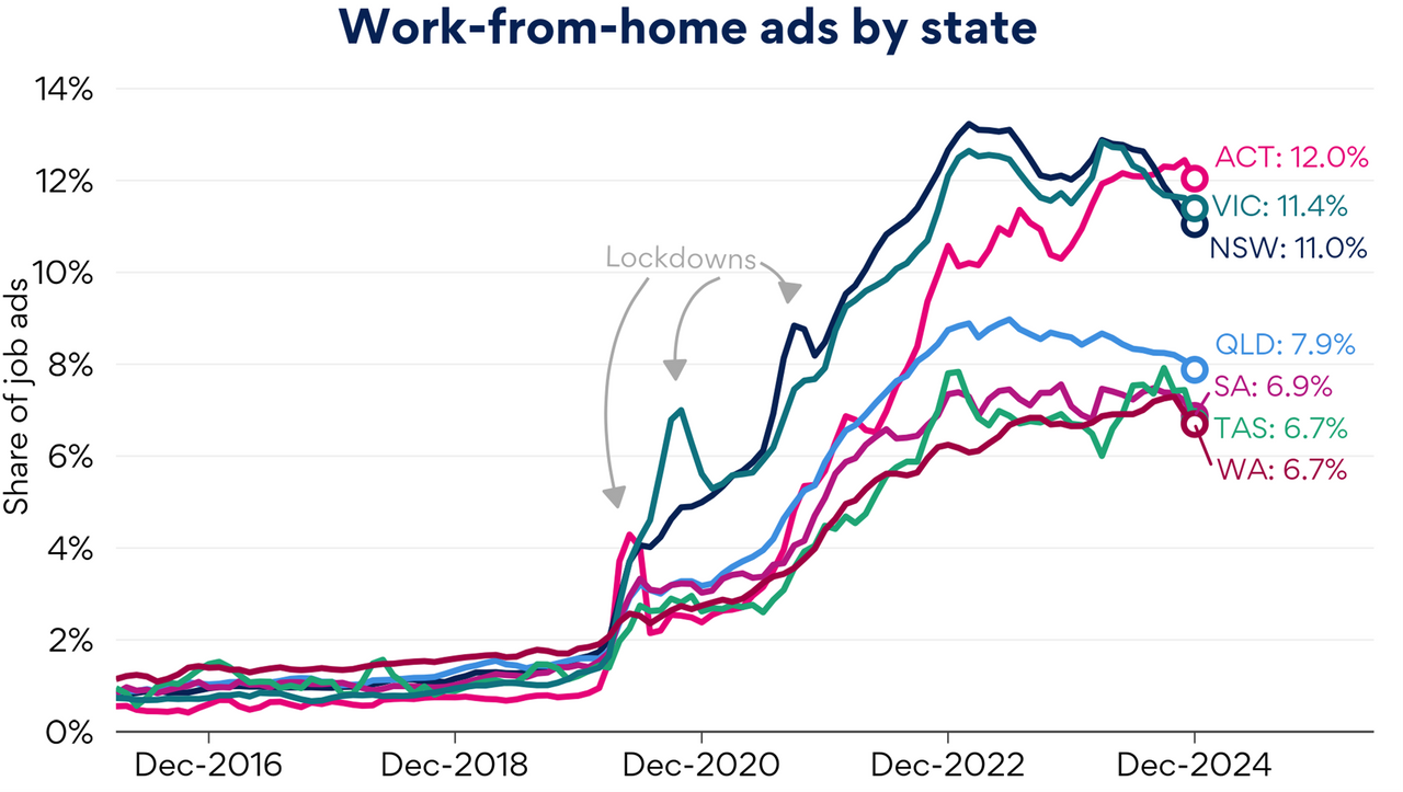 Despite some high profile local and international return-to-office mandates, the share of Australian job ads offering WFH has declined only very slightly since it peaked in 2023.
