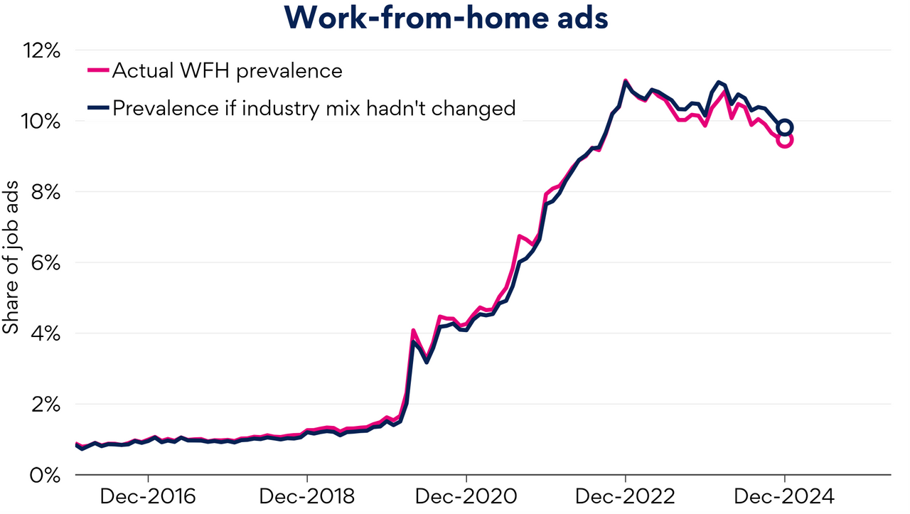 Job ads highlighting WFH have declined since rebounding in early 2024