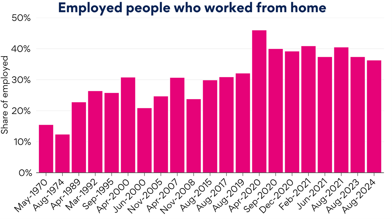 The share of people working from home has increased over time, with a sharp increase at the onset of COVID, followed by a slow decline since. its pre-COVID levels.