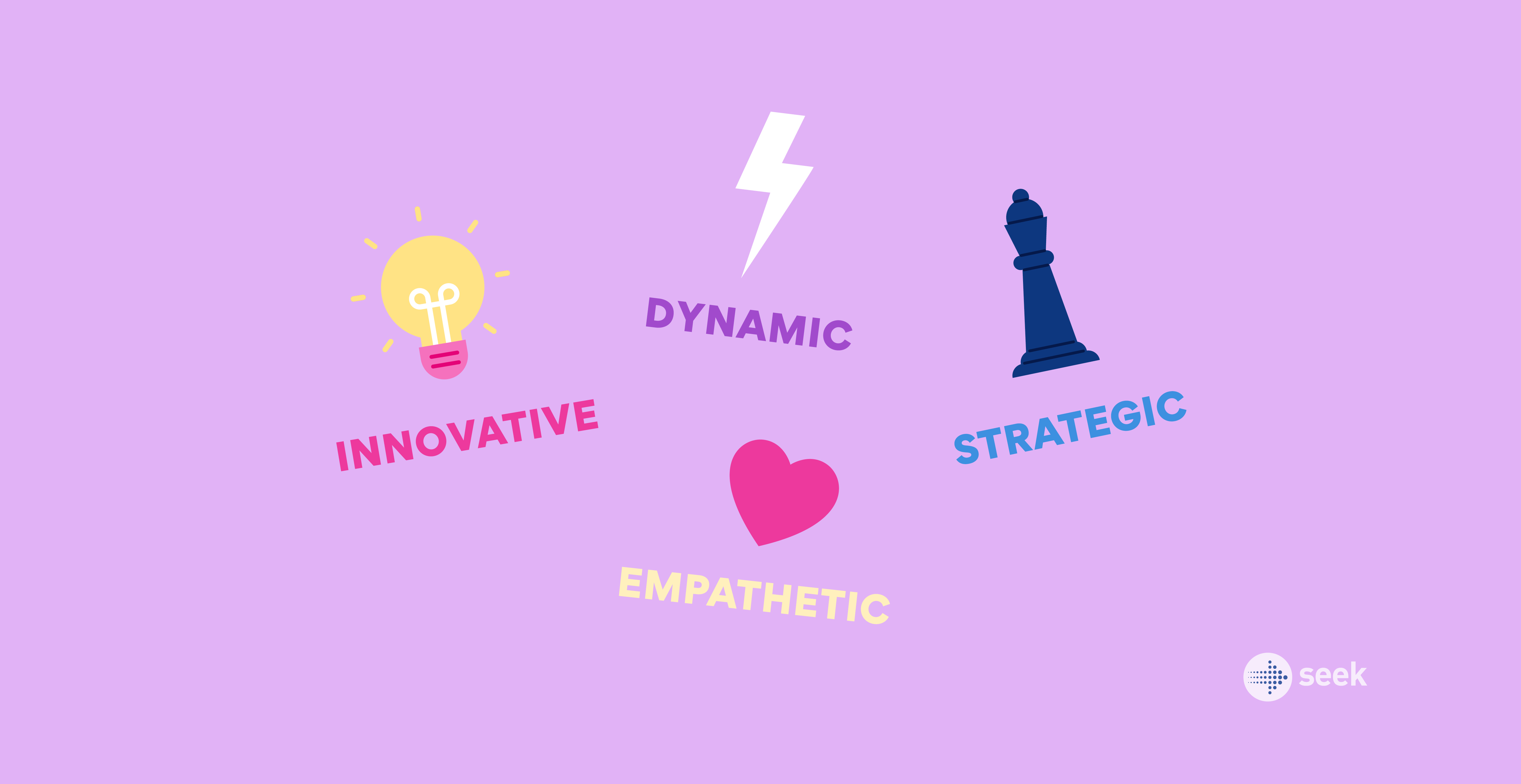 Leadership and management: innovative, decisive, collaborative, determined, disciplined, reliable, inspiring, confident, proactive, commanding, principled, dynamic, influential, assured