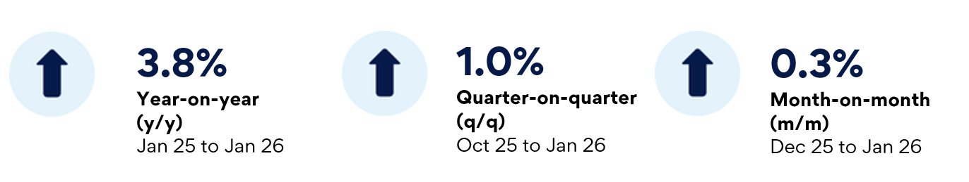 Advertised salaries rose by 0.3% m/m in January and 1.0% q/q, with growth relatively stable over the past six months.